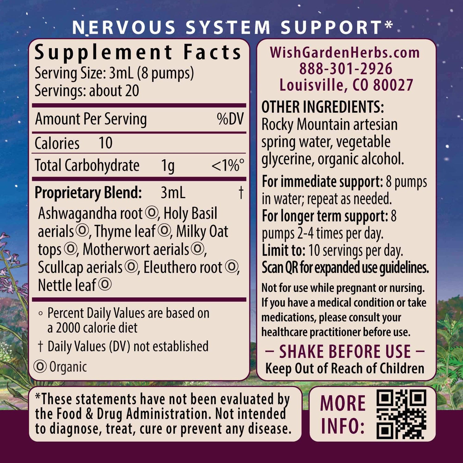 Organic Ashwagandha root (Withania somnifera), organic Holy Basil (Tulsi) aerials (Ocimum spp.), organic Thyme leaf (Thymus vulgaris), organic Milky Oat tops (Avena sativa), organic Motherwort aerials (Leonurus cardiaca), organic Scullcap aerials (Scutellaria lateriflora), organic Eleuthero root (Eleutherococcus senticosus), organic Nettle leaf (Urtica dioica), Rocky Mountain artesian spring water, vegetable glycerine & organic gluten-free alcohol.