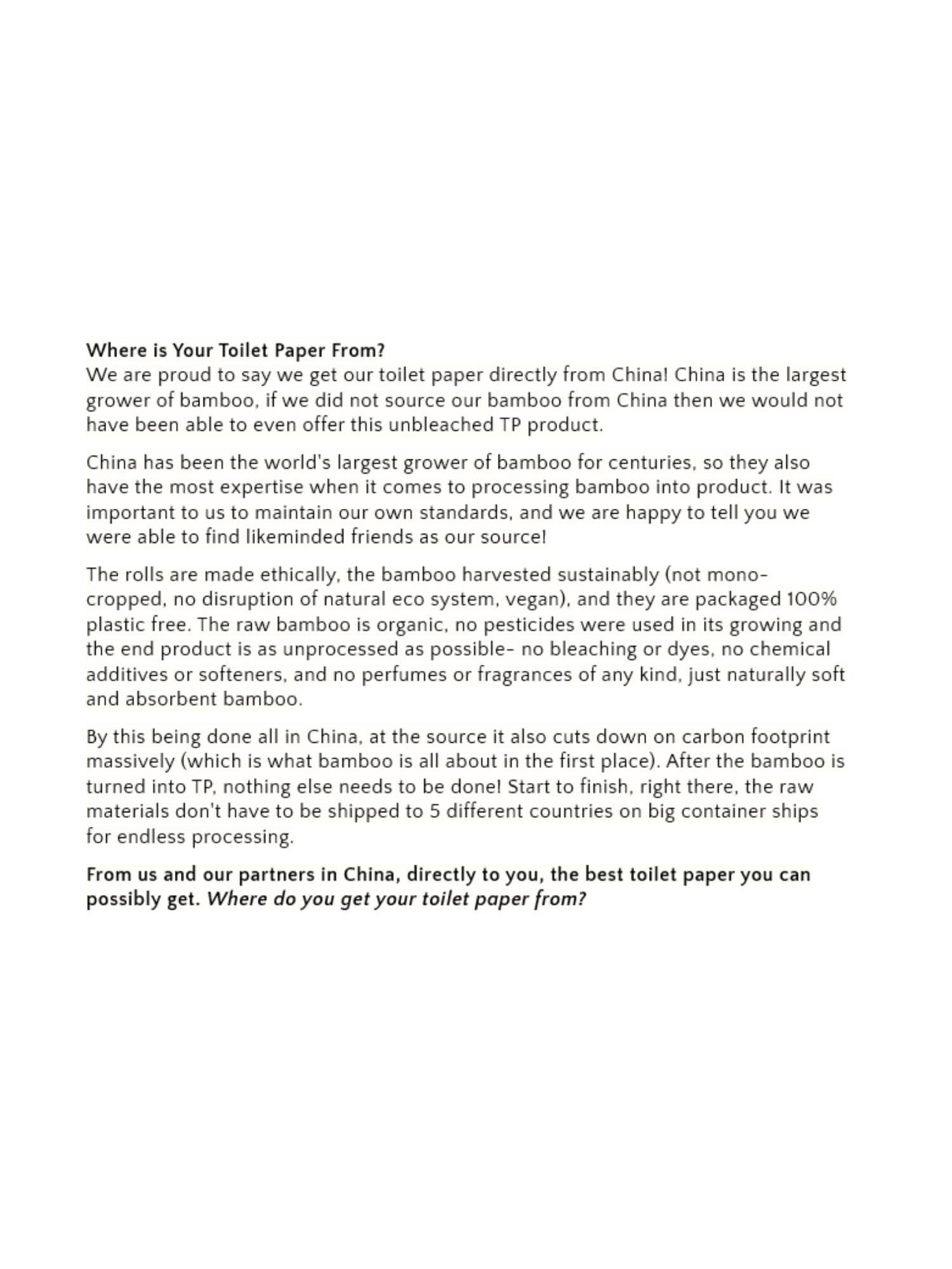 Soft | Unlike other bamboo or "eco" type toilet paper our toilet paper is extra thick and has a very soft feel, you only need a few sheets! Extra soft and fluffy, 3-ply Bamboo Toilet Paper. Made from 100% renewable organic bamboo = no harsh chemicals.