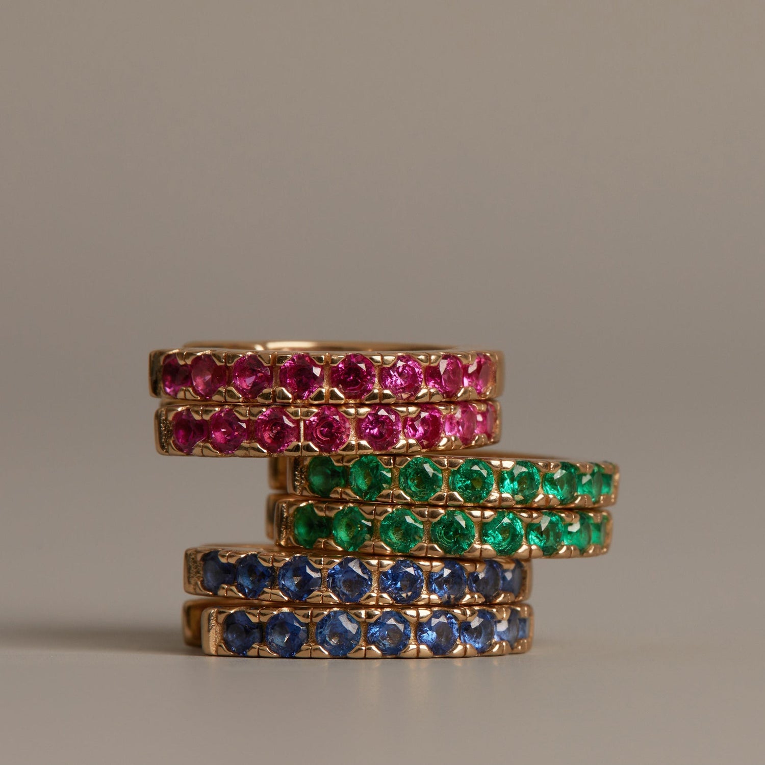 High quality lab grow round blue sapphire are pave set in this hinging huggie. Set in vermeil, these huggies are wear all day comfortable. Pair perfectly with our Lab Grown Blue Sapphire Tennis Necklace.