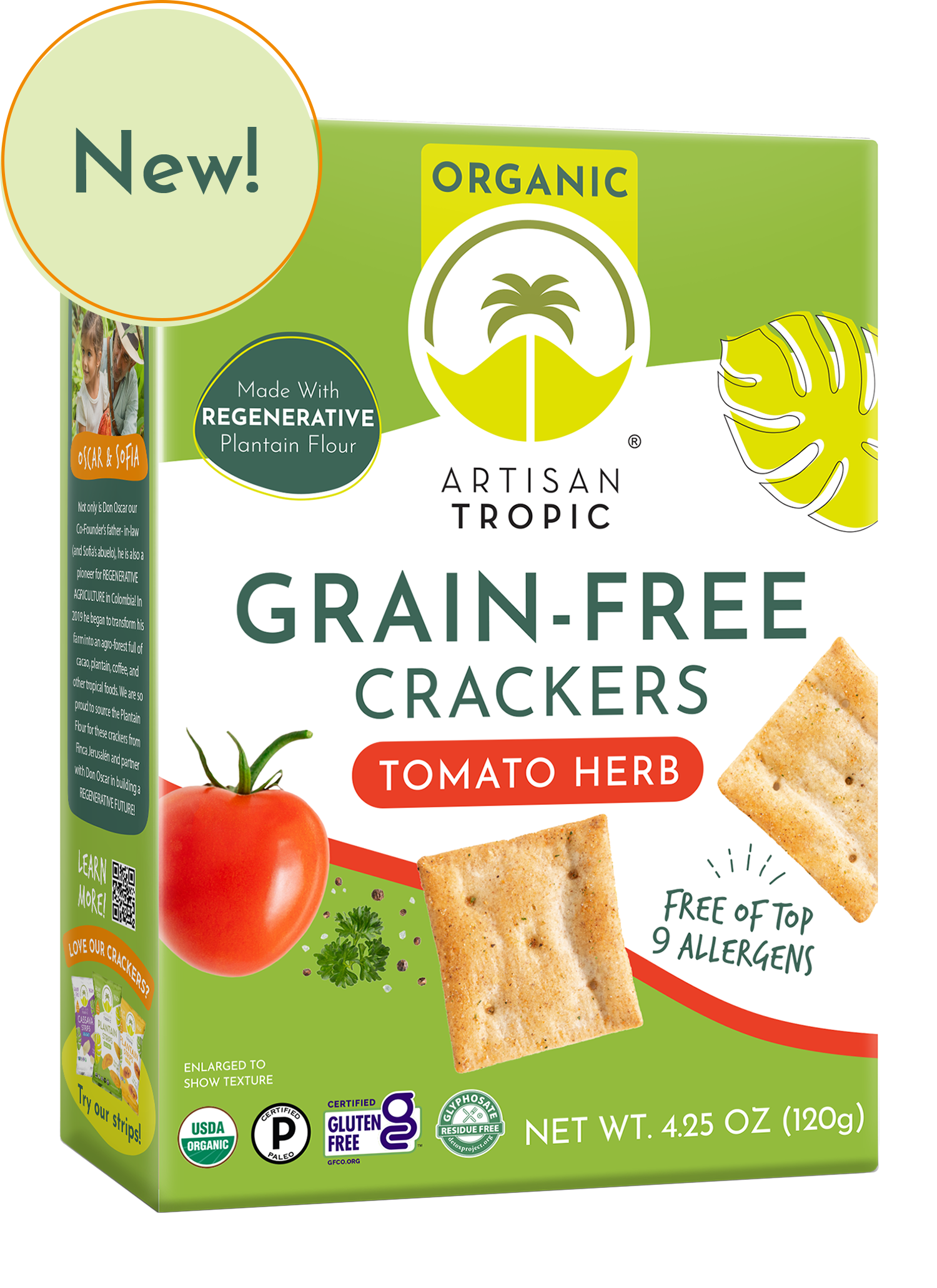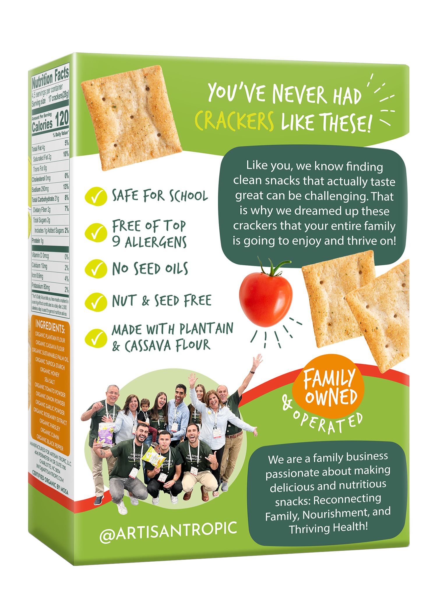 Introducing our NEW Tomato Herb Crackers – a delicious, grain-free snack made with organic plantain and cassava flour. These crackers are free from the top 9 allergens, contain no seed oils, and are nut and seed-free, making them a perfect choice for the whole family. Each cracker delivers a delightful crunch infused with real tomato and culinary herbs, offering a burst of flavor in every bite. Whether you’re enjoying them solo or pairing them with your favorite cheese, dip, or meal, these light and crispy crackers are perfect for any occasion. Family-approved and irresistibly tasty, once you try them, you'll find yourself reaching for more. Snack consciously and savor the goodness! Taste the difference in every bite and enjoy a snack that nourishes and satisfies.