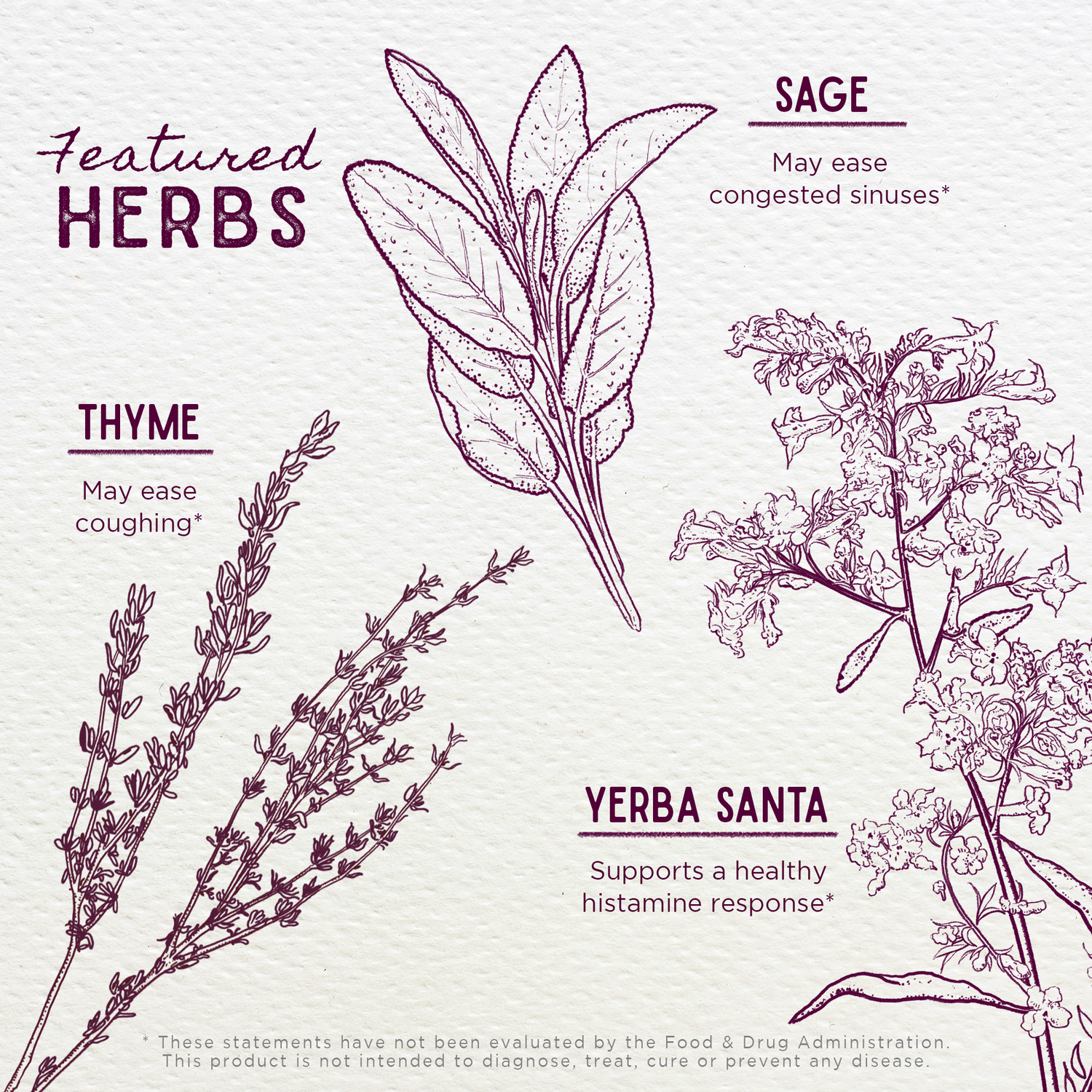 - Thyme leaf: Thymus vulgaris may help soothe occasional cough, supports immune system function, and provides free radical scavenger activity.