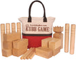 In 2004, we were introduced to the game of Kubb (pronounced "koob") by our friends at Bald Eagle Boys Camp in Pennsylvania. Since then, Kubb has quickly become one of our favorite family yard games. Also called "Viking Chess", Kubb originated on the island of Gotland in Sweden. It is quickly gaining popularity in the United States because of its wonderful mix of throwing skill, strategy, and luck. It has been compared to "Horseshoes, Bocce, and Cornhole all rolled into one great game". Kubb is easy to learn to play and can be played with 2-12 players to accommodate large or small groups. Our Kubb Games are made in Holmes County, Ohio by our Amish friends. Each Deluxe Kubb Game Set is made out of Maple Hardwood harvested in the Appalachians. Each piece is made out of solid Hard Maple wood. Hard Maple wood is one of the hardest woods available. We only use solid pieces of wood in our Kubb Games, no glued together pieces like cheaper sets. Our Kubb Games are Official Size according to the U.S. National Kubb Championship Rules. The King is 10" high x 3 1/4" wide, the Kubbs are 5 15/16" high x 2 3/4" wide, and the Batons are 11 7/8" long x 1 3/4" diameter. The Kubb Set includes 1 King, 10 Kubbs, 6 Throwing Batons, and 4 Boundary Stakes. Each of the kubbs and throwing batons feature beveled edges to resist chipping and cracking. Each game piece is finished with a clear protective finish for ultimate durability. Finally, it comes in a lovely burlap zippered carry bag for ease of storage and transporting.