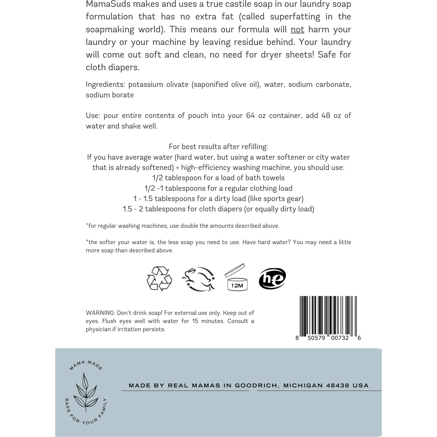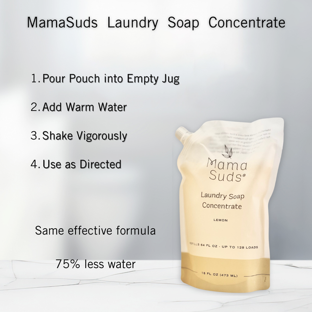 Are you already a big fan of MamaSuds Laundry Soap? Less plastic and less water means we can save carbon energy. One pouch of concentrate will make 64 fl oz of MamaSuds Laundry Soap!