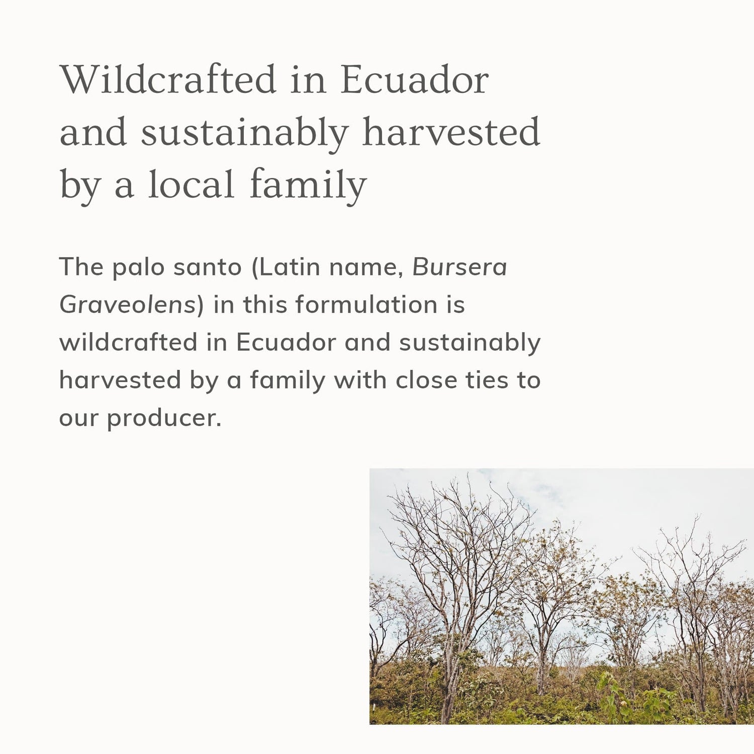 The palo santo (Latin name, Bursera Graveolens) in this formulation is wildcrafted in Ecuador and sustainably harvested solely from fallen trees and branches. We source specifically from a non-endangered species, not to be confused with Bulnesia Sarmientoi. Palo santo essential oil is extracted using vapor distillation, without the use of dangerous chemicals or solvents. This ensures a safe, eco-conscious approach without harming the land or destroying a single tree. We partner with a distributor who keeps a close relationship and connection to the family and with the local communities in Ecuador. They are committed to reforestation and giving back to the planet. Since 2008, our partner has planted over 30,000 trees back into the area and continues to support farmworkers with a fair wage. Their partnership has become a relationship that provides a lasting livelihood for the coastal communities who gather and steward this “Holy Wood” from South America.