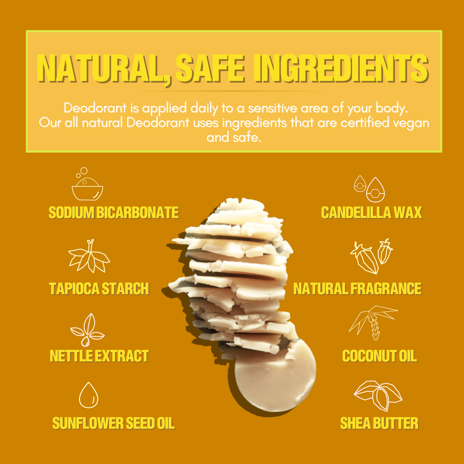 Cocos Nucifera (Coconut) Oil, Sodium Bicarbonate, Tapioca Starch, Butyrospermum Parkii (Shea) Butter, Euphorbia Cerifera (Candelilla) Wax, Fragrance, Helianthus Annuus (Sunflower) Seed Oil, Urtica Dioica (Nettle) Extract