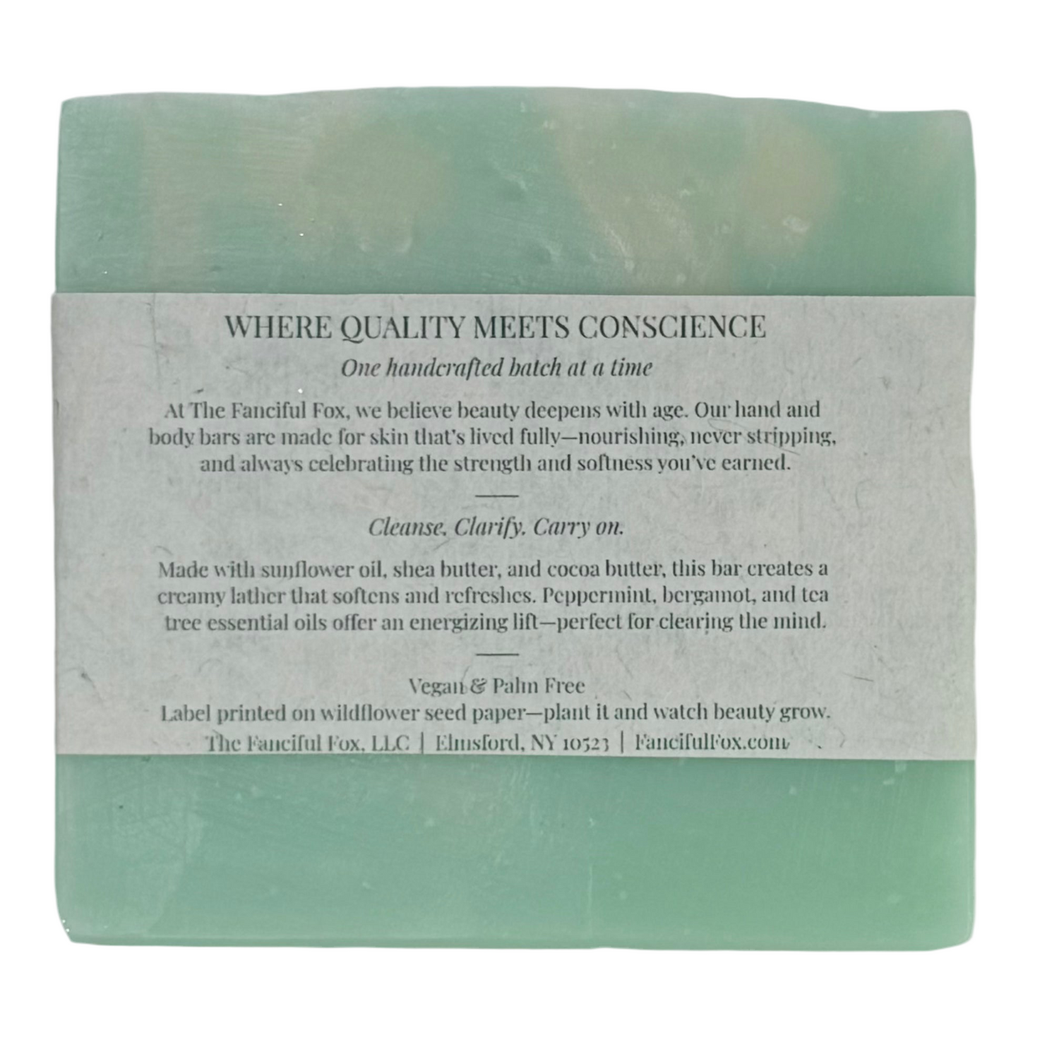 Made with olive oil, sunflower oil, shea butter, and cocoa butter, this bar lathers into a refreshing cleanse that leaves skin soft, not stripped. Peppermint, bergamot, and tea tree essential oils bring clarity and lift—perfect for mornings, resets, and minds that need clearing.