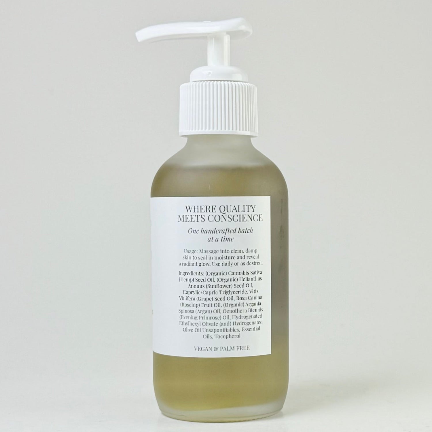 Ingredients: (Organic) Cannabis Sativa (Hemp) Seed Oil, (Organic) Helianthus Annuus (Sunflower) Seed Oil, Caprylic/Capric Triglyceride, Vitis Vinifera (Grape) Seed Oil, Rosa Canina (Rosehip) Fruit Oil, (Organic) Argania Spinosa (Argan) Oil, Oenothera Biennis (Evening Primrose) Oil, Hydrogenated Ethylhexyl Olivate (and) Hydrogenated Olive Oil Unsaponifiables, Essential Oils, Tocopherol