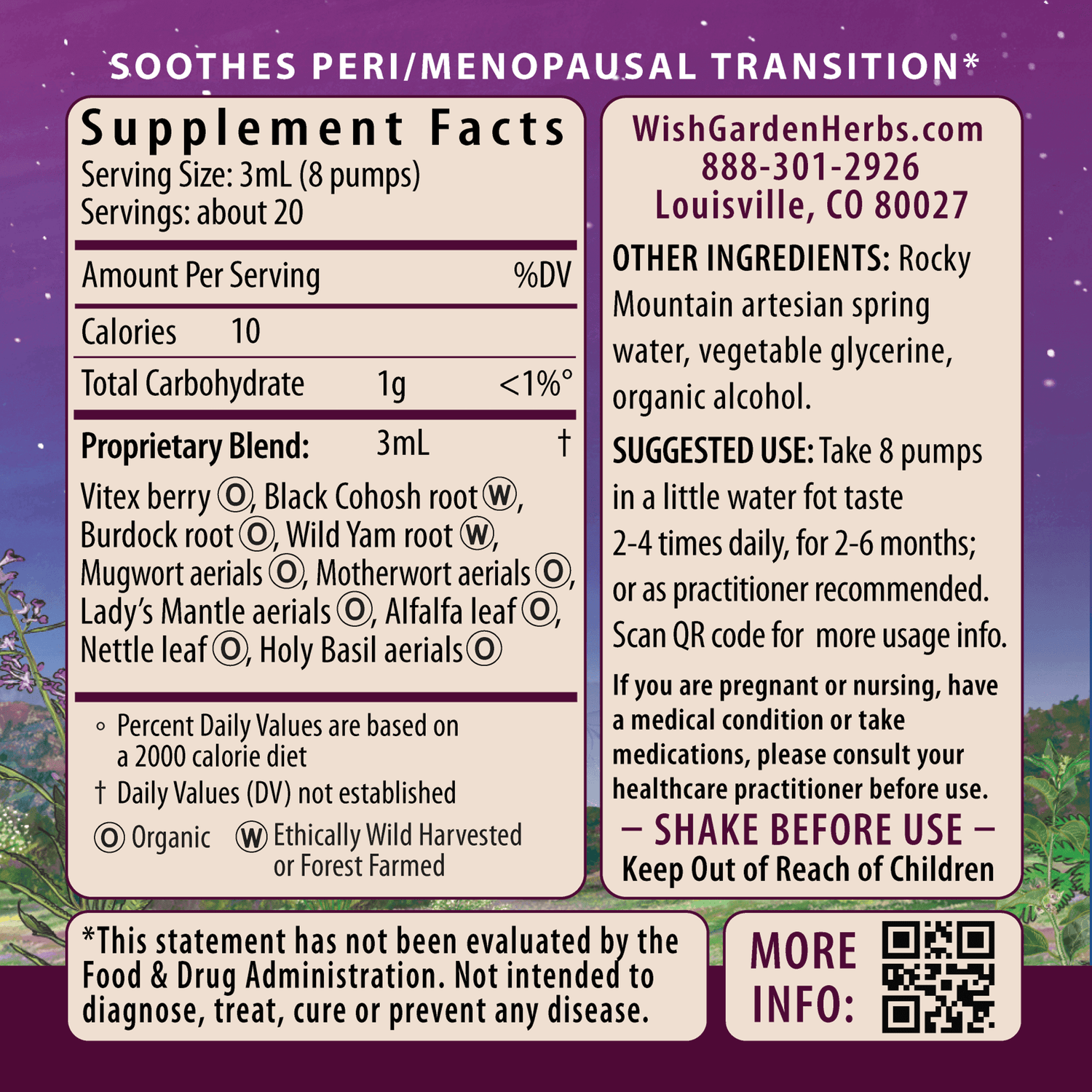 Organic Vitex berry (Vitex agnus-castus), Black Cohosh root (Actaea racemosa (syn. Cimicifuga racemosa)), organic Burdock root (Arctium lappa), Wild Yam root (Dioscorea villosa), organic Mugwort aerials (Artemisia vulgaris), organic Motherwort aerials (Leonurus cardiaca), organic Lady's Mantle aerials (Alchemilla vulgaris, A. xanthochlora), organic Alfalfa leaf (Medicago sativa), organic Nettle leaf (Urtica dioica), organic Holy Basil (Tulsi) aerials (Ocimum spp.), Rocky Mountain artesian spring water, vegetable glycerine & organic gluten-free alcohol.