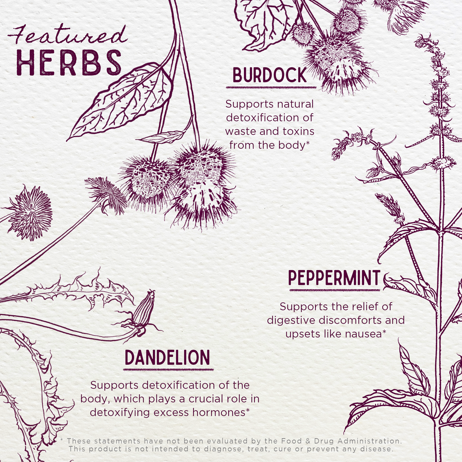 - Dandelion root: Taraxacum officinale is highly nutritious and contains potent free radical scavengers that support the body's natural defenses against environmental stress. Dandelion root supports healthy liver function and digestion with its prebiotic effects. It encourages the body's natural cleansing processes and supports healthy bile production. Dandelion root also supports hormone balance and reproductive wellness.