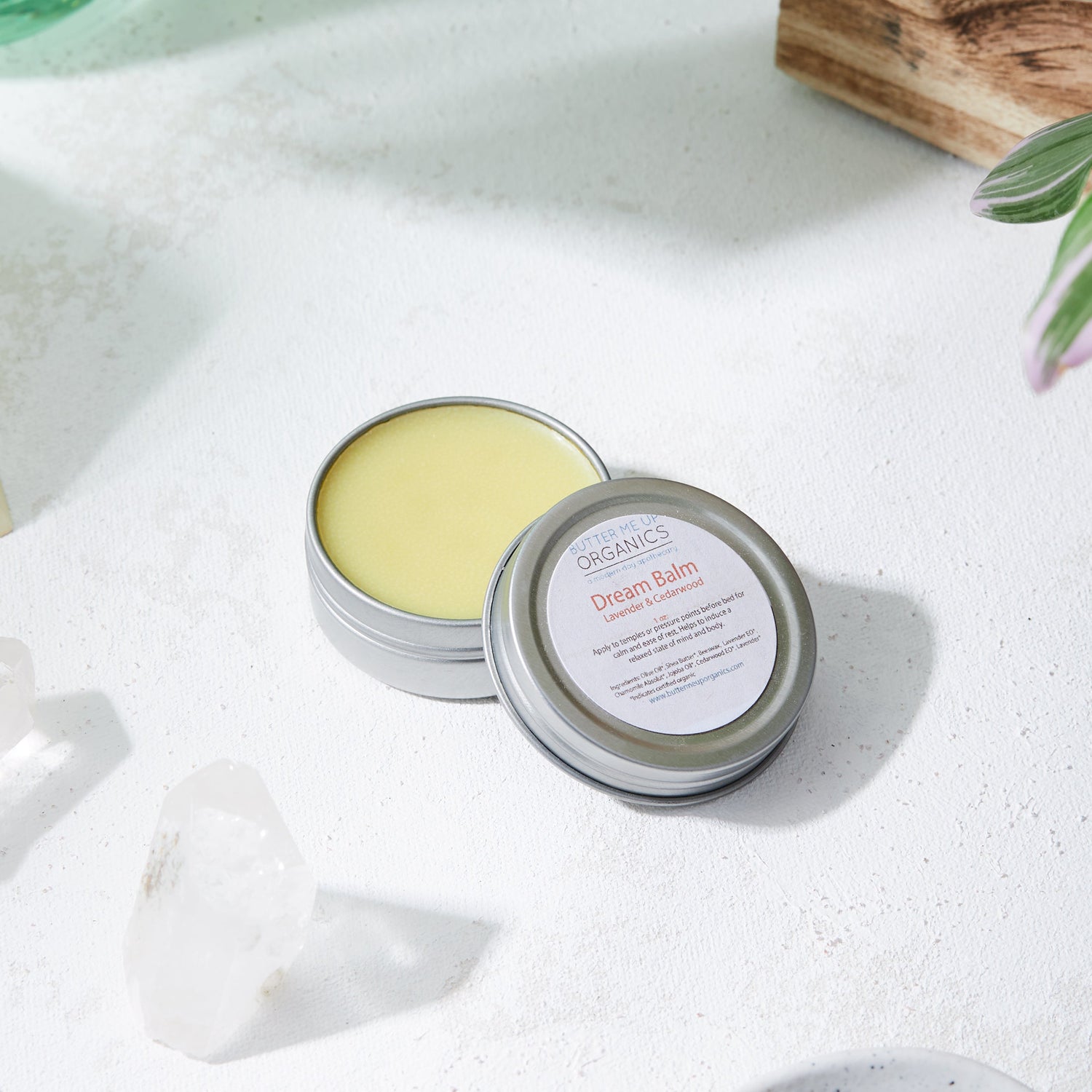 Put this balm on temples or pressure points to help ease the mind and body into sleep. Ingredients: olive oil*, Shea Butter*, Beeswax, Cedarwood EO*, Lavender EO*, Jojoba Oil*, Chamomile Absolut*