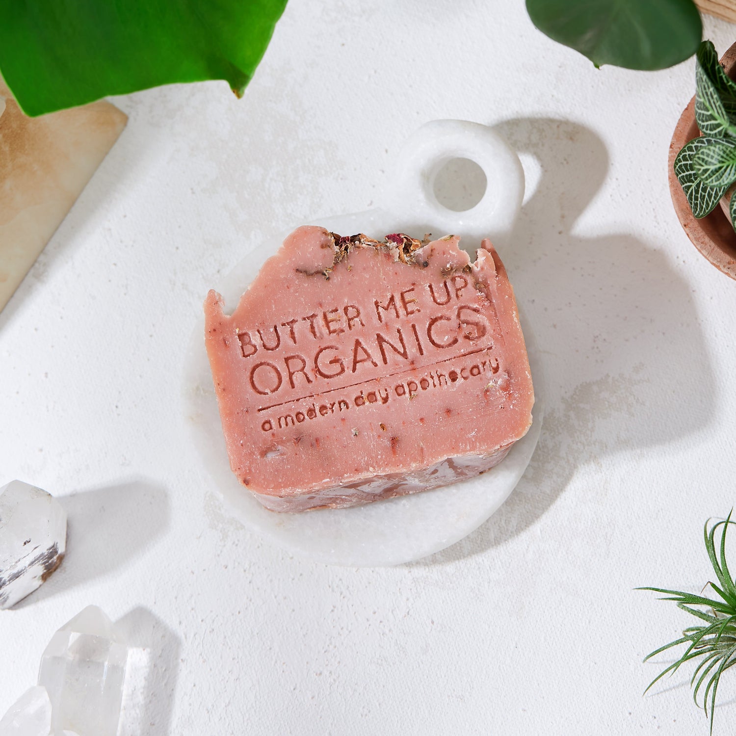 Ingredients: Saponified Olive Oil*, Coconut Oil*, Safflower Oil*, Shea Nut Oil*, Camelina Oil*, Rose Absolut, Jojoba Oil, Rose Petals*, Pink Brazilian Clay *Indicates certified Organic