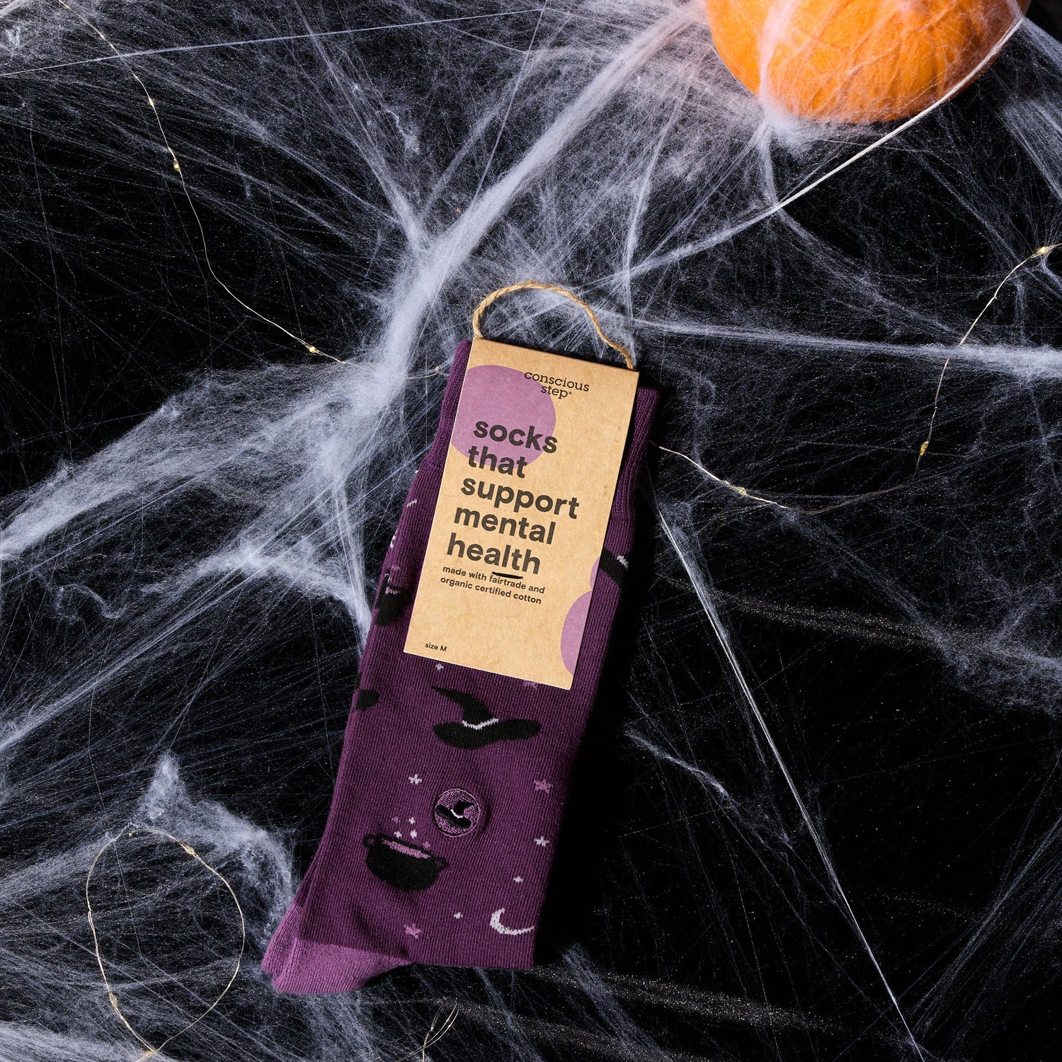 Brew up some magic or stir up some trouble with this wickedly cozy purple pair adorned with witches, bubbling cauldrons and zooming broomsticks.