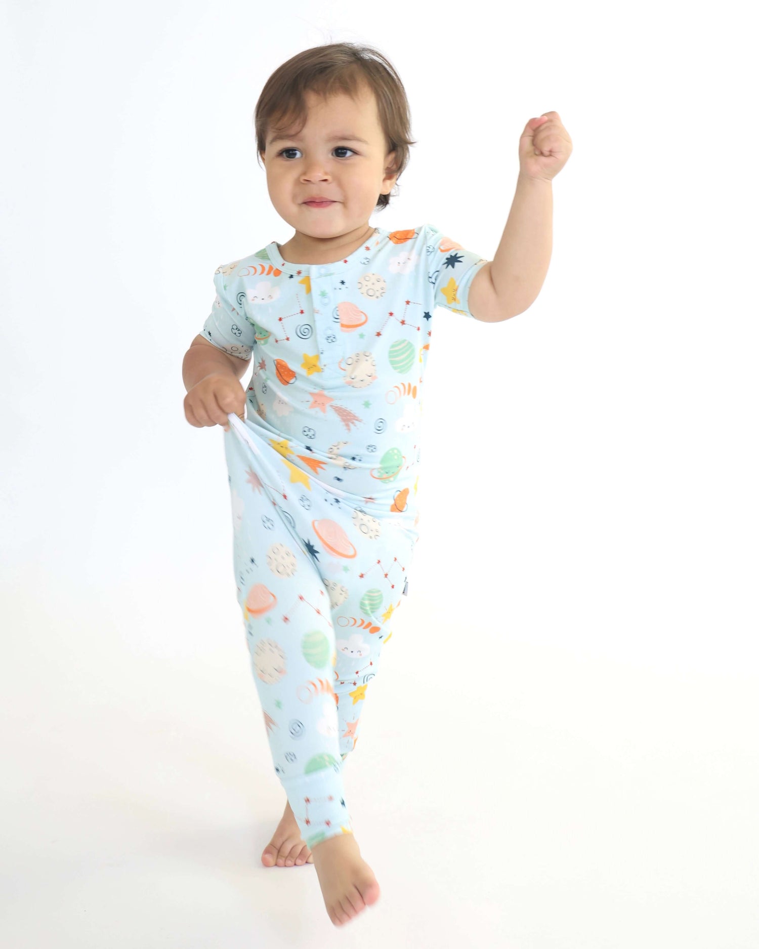 Adventure starts here with the Bamboo Pull Up Romper. This dreamy, space-inspired print is filled with smiling moons, twinkling stars, cheerful planets and drifting clouds across a starlit sky. Itās designed to spark imagination, making every momentāfrom backyard play to bedtime storiesāfeel a little more magical.