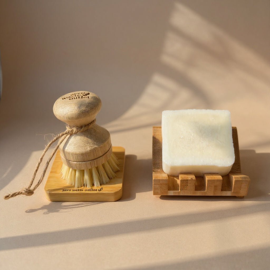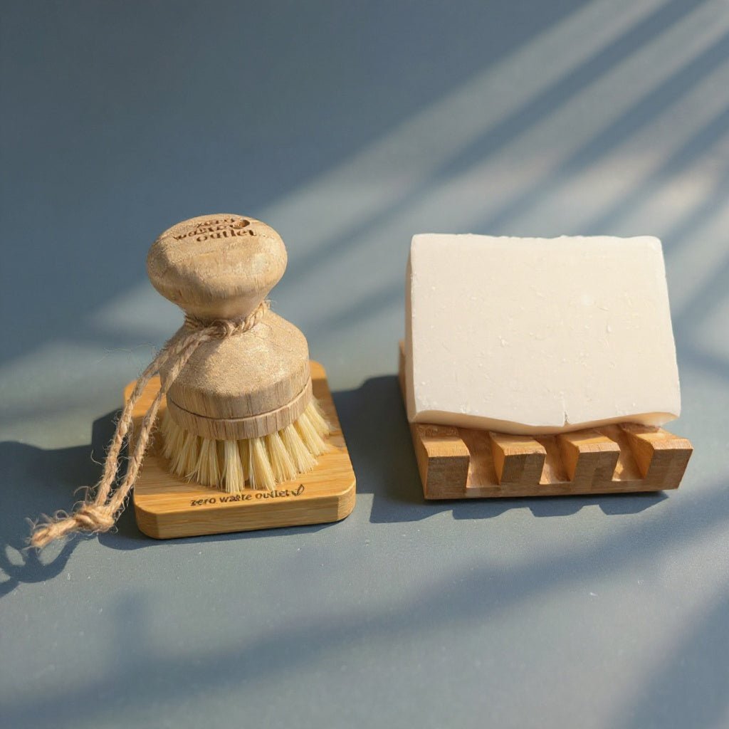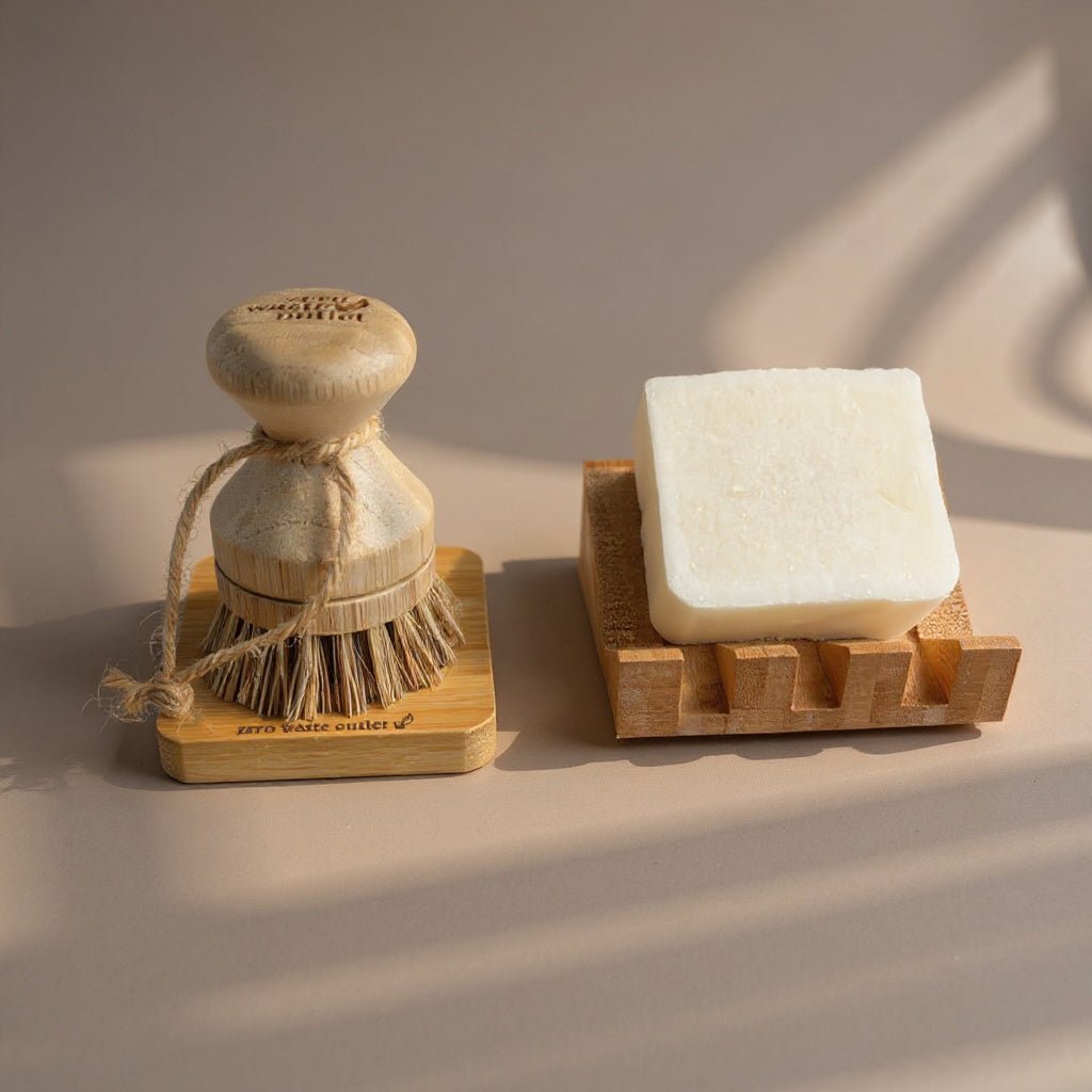 palm pot brush and small square soap dish