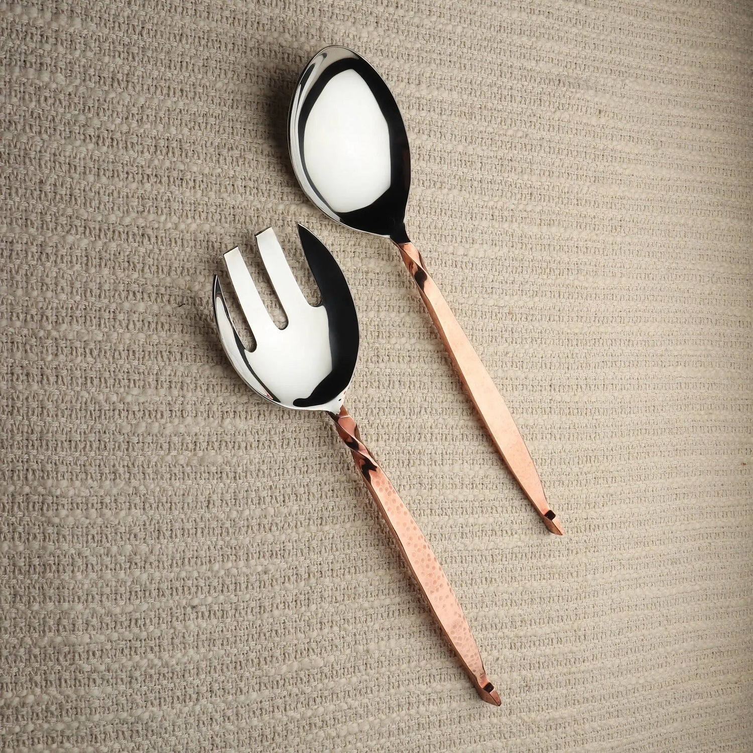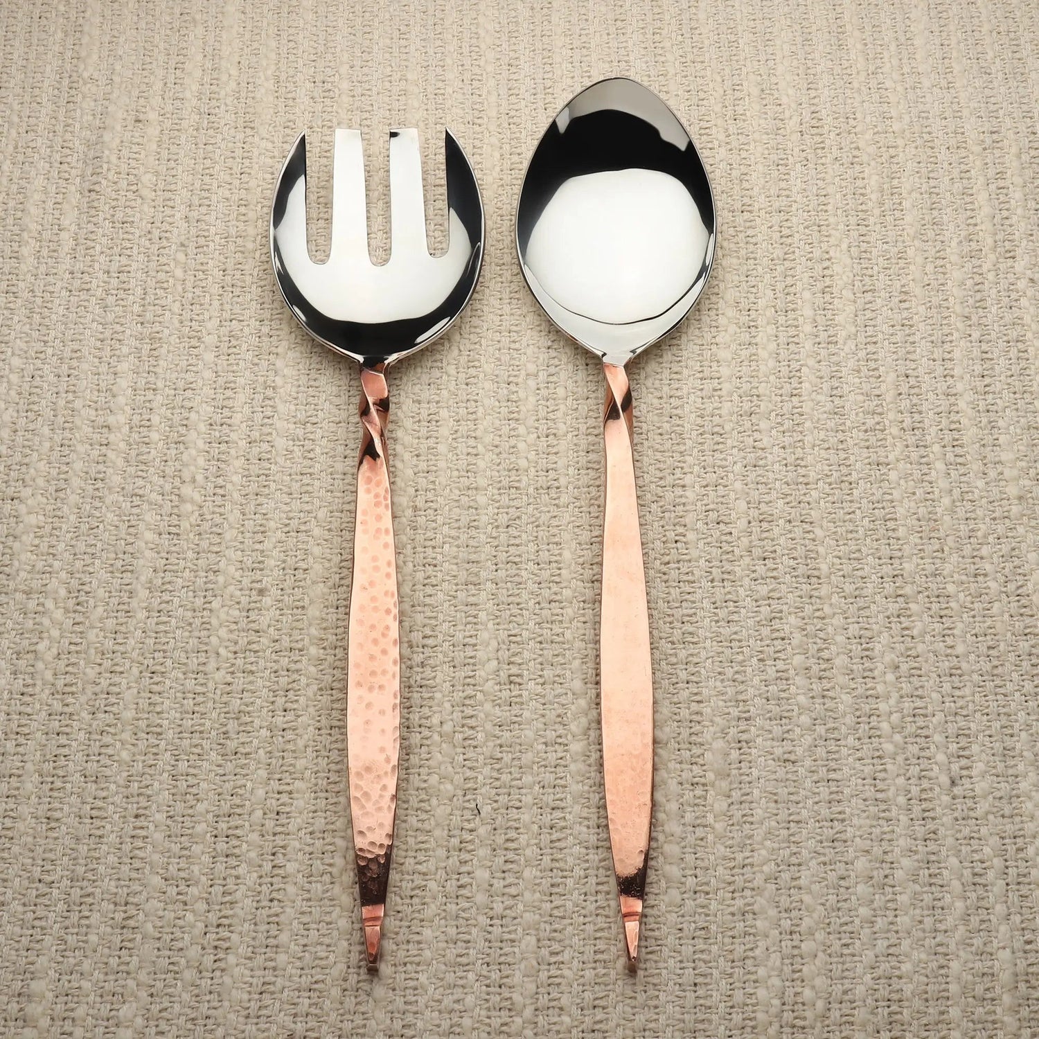 The Twisted Urban Salad Serving 2 Pc. Set serves up the salad with an artistic flair! Hand-hammered twisted handles finished in antique copper contrast beautifully with the highly polished serving fork and spoon. Crafted to last, this distinctive set complements classic and contemporary dinnerware.
