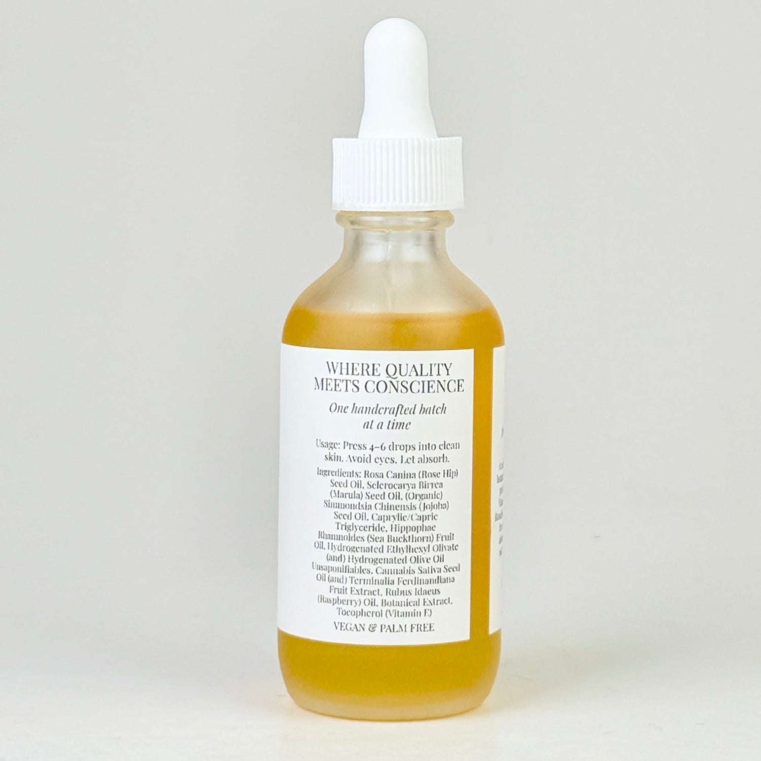 Ingredients: Rosa Canina (Rose Hip) Seed Oil, Sclerocarya Birrea (Marula) Seed Oil, (Organic) Simmondsia Chinensis (Jojoba) Seed Oil, Caprylic/Capric Triglyceride, Hippophae Rhamnoides (Sea Buckthorn) Fruit Oil, Hydrogenated Ethylhexyl Olivate (and) Hydrogenated Olive Oil Unsaponifiables, Cannabis Sativa Seed Oil & Terminalia Ferdinandiana Fruit Extract, Rubus Idaeus (Raspberry) Oil, Botanical Extract, Tocopherol (Vitamin E)
