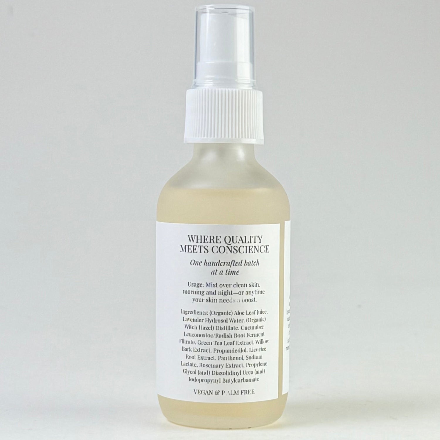 Ingredients: (Organic) Aloe Leaf Juice, Lavender Hydrosol Water, (Organic) Witch Hazel) Distillate, Cucumber Leuconostoc/Radish Root Ferment Filtrate, Green Tea Leaf Extract, Willow Bark Extract, Propandediol, Licorice Root Extract, Panthenol, Sodium Lactate, Rosemary Extract, Propylene Glycol (and) Diazolidinyl Urea (and) Iodopropynyl Butylcarbamate