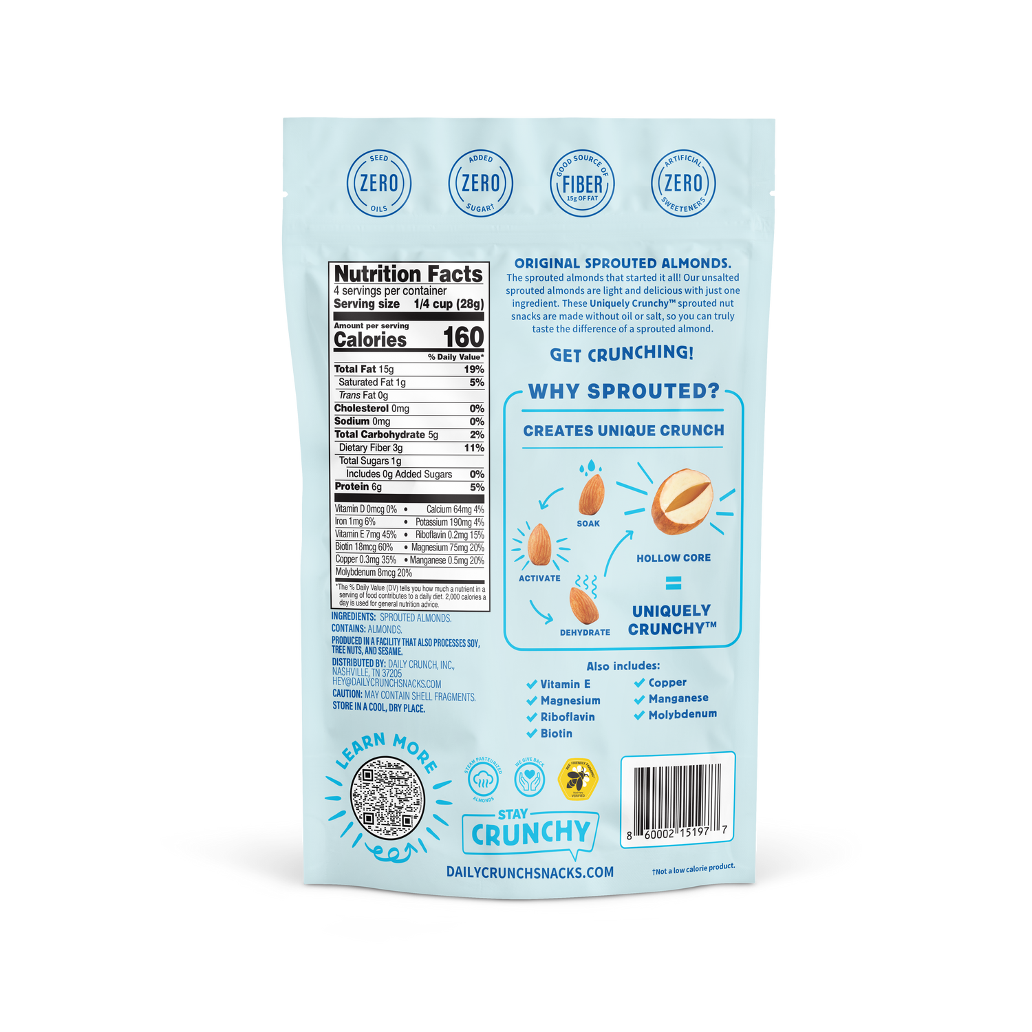 UNSALTED SPROUTED ALMONDS! The sprouted almonds that started it all! Our unsalted sprouted almonds are light and delicious with just one ingredient. These Uniquely Crunchy™ sprouted nut snacks are made without oil or salt, so you can truly taste the difference of a sprouted almond. Get Crunching!
