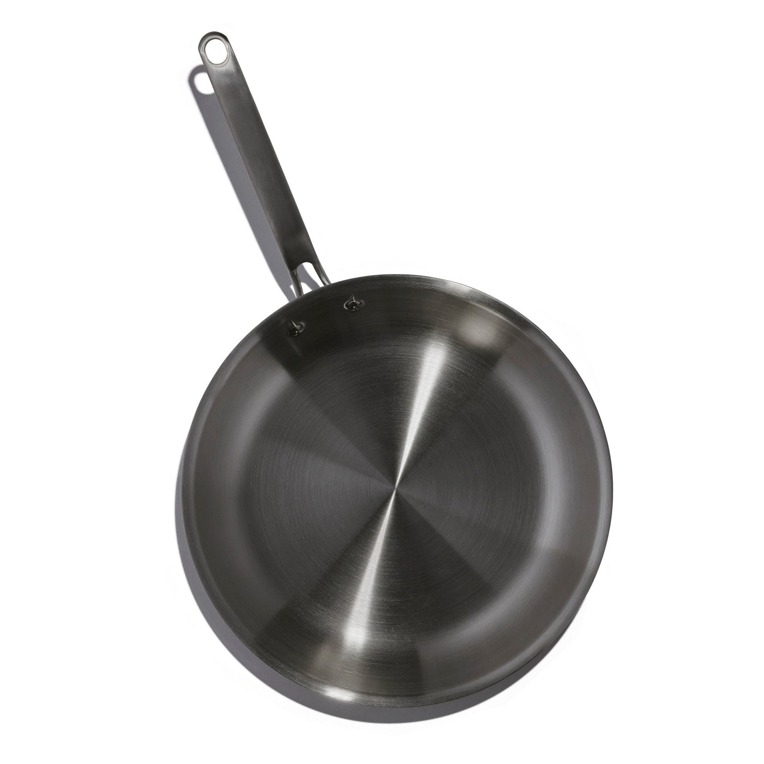 This fry pan's large size provides ample cooking space, plus fully clad stainless steel distributes heat evenly across all surfaces. The thick metal body is durable and retains heat for an excellent sear.