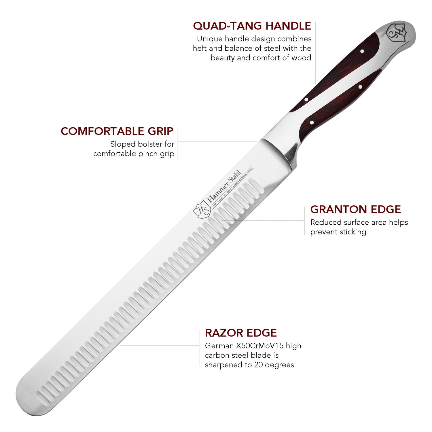 A knife with a razor sharp edge that evenly cuts thin slices of ham, prime rib, and other meats.