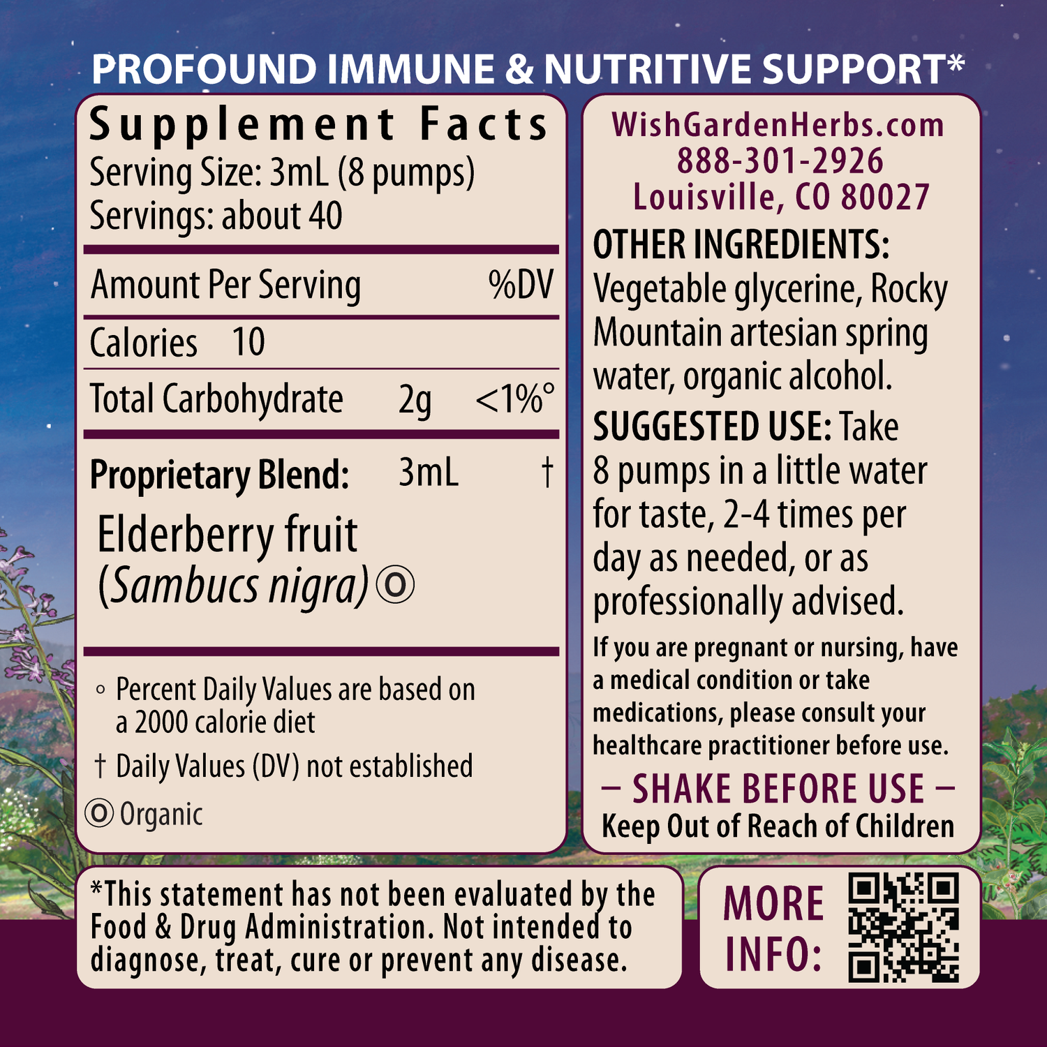 Organic Elderberry fruit (Sambucus nigra), Vegetable glycerine, Rocky Mountain artesian spring water & organic gluten-free alcohol.