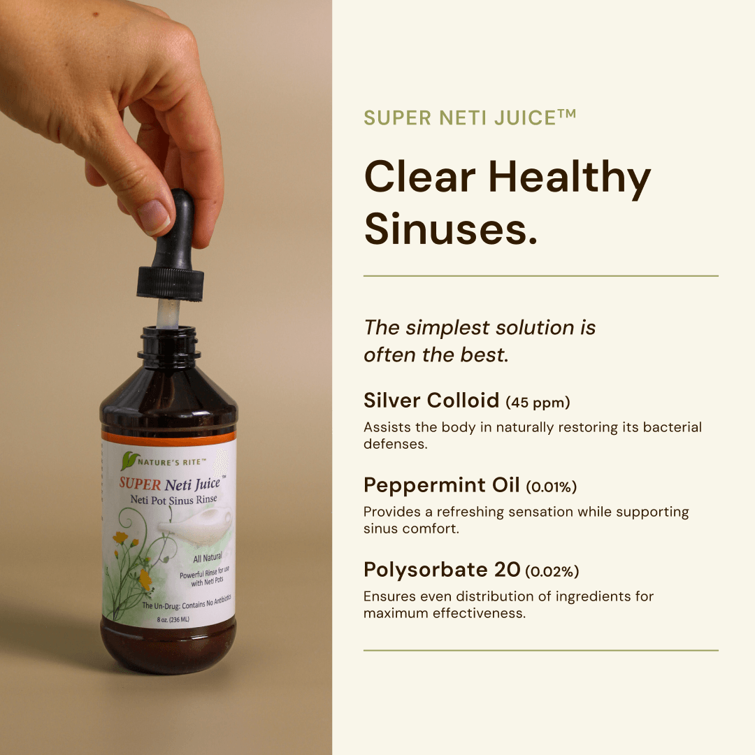 Experience deep sinus cleansing with Super Neti Juice, a natural solution for refreshing your nasal passages. Formulated with premium quality Silver Colloid, this unique blend promotes sinus clarity and supports your nasal health without relying on harsh chemicals or antibiotics. Perfect for addressing sinus irritation caused by allergens, pollutants, or dryness.