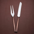 Carve and serve delicious roasted meats with rustic flair! Our Sundance Meat Carving 2 Pc. Set showcases square antique copper handles with polished utensils. The carving fork has two symmetrical tines with rounded edges and the carving knife has a rounded tip and a sharp cutting edge.