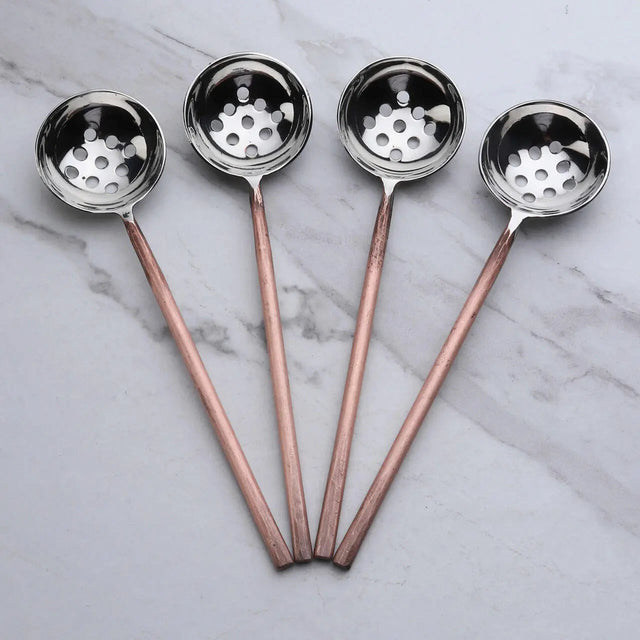 Our Sundance Olive Spoons 4 Pc. Set shines with simplicity and sophistication. Each polished steel spoon catches the eye with its antique copper handles. The round spoons let you gently remove olives and cherries from jars and the perforations are perfect for straining brine or syrups.