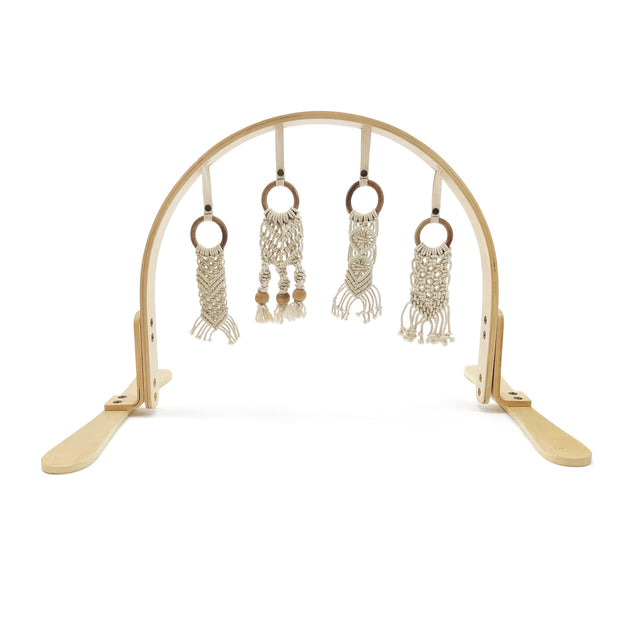 Get ready for the best play date ever! Our height-adjustable play gym has a 100% birch wood frame finished with non-toxic stains and lacquers. The macrame toys are hand-knotted by artisans in India using organic cotton rope. They engage baby through texture and tactile sensation, not noise—so you can rest while they play. The toys are removable—can be used away from the gym as stroller or carseat toys and all of our "Stroller Toys" fit on the gym! Best of all, they'll never need a ride home at the end of the play date.