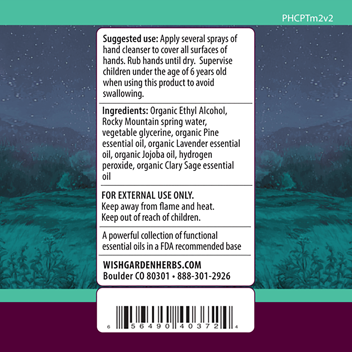 Organic Ethyl Alcohol, Rocky Mountain spring water, vegetable glycerine, organic Pine essential oil, organic Lavender essential oil, organic Jojoba oil, hydrogen peroxide, organic Clary Sage essential oil