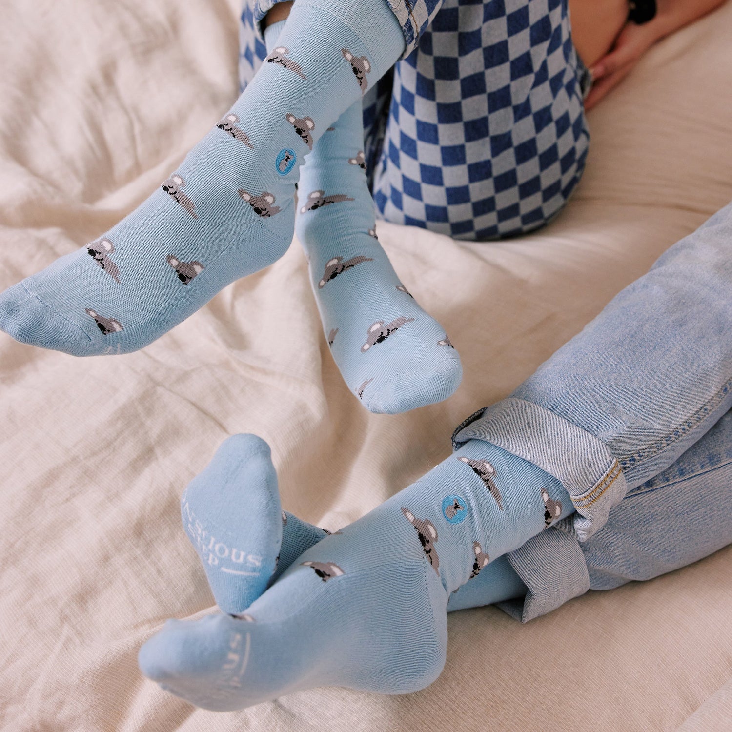 A Down Under wildlife gift box for animal lovers! Three pairs include orange kangaroos on gray melange; light blue crocodiles on green; and sleepy koalas on light blue.