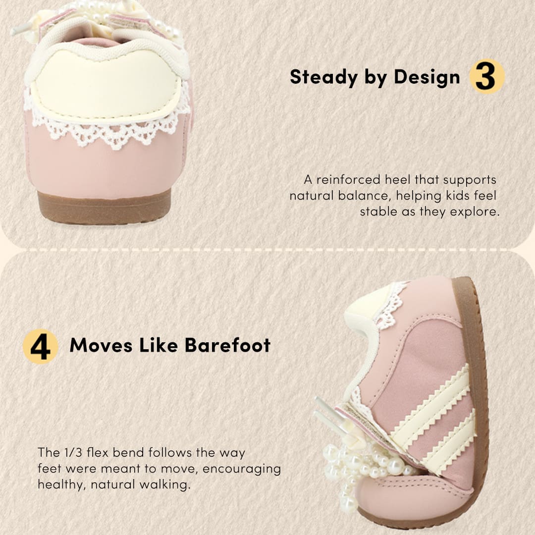 Roselle brings a touch of elegance to everyday play. Designed with soft materials, a flexible barefoot-friendly sole, and easy on/off straps, these sneakers keep little feet comfy while adding a hint of charm to every outfit. Perfect for school, weekends, and special moments.