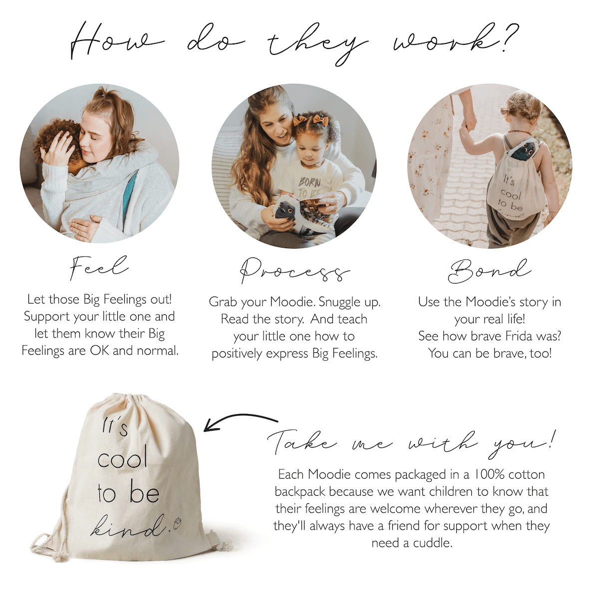 Your little one has Big Feelings but only small words to describe them. When those words fail them, it triggers frustration and meltdowns. The award-winning Moodies from Owl & Oak are an all-in-one toy & book that makes it easy to earn about and communicate Big Feelings. Teach awareness and positive expression with Elliot, Frida, Penny, & their friends! Each Cuddly Storybook Friend was crafted along with early childhood development experts.Each Moodie comes with an "It's cool to be kind" backpack, and an audiobook file.