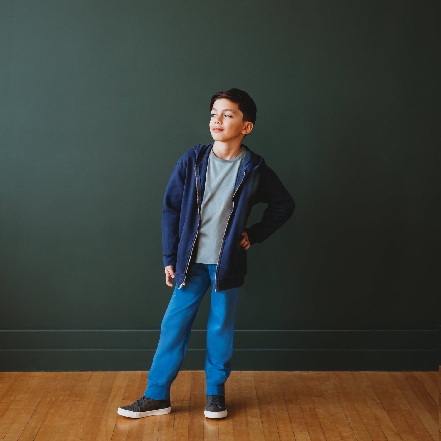 This warm and stylish 100% Cotton Fleece Zip Hoodie is soft and cozy. It is the perfect everyday piece to layer over a tee in the fall or under a jacket in the winter. This unique design has big, nearly invisible front pockets sleekly placed on the sides, as well as two large inside pockets that kids will love to use.