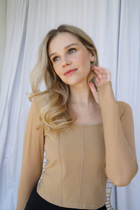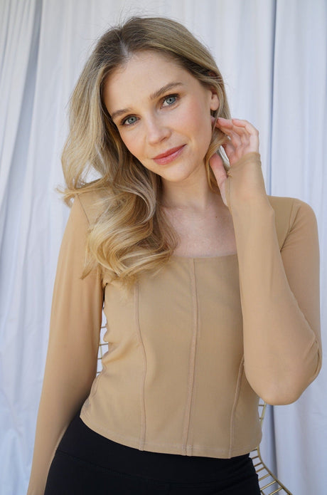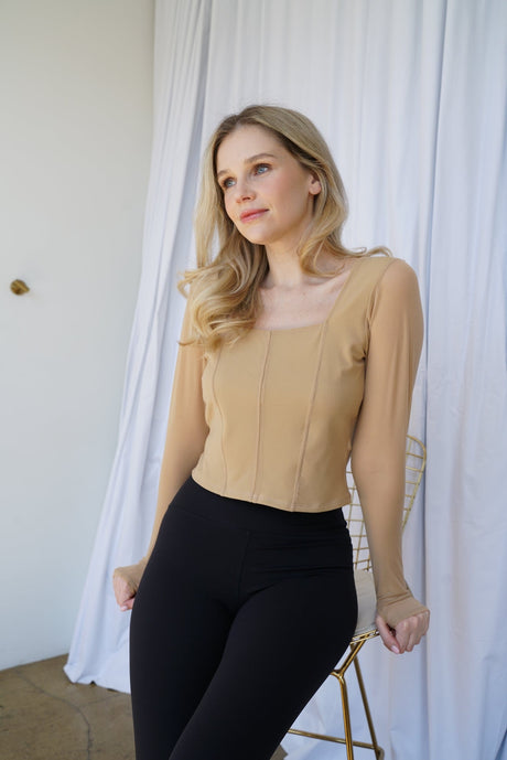 Hailey Mesh and Cotton Long Sleeve Top - Latte