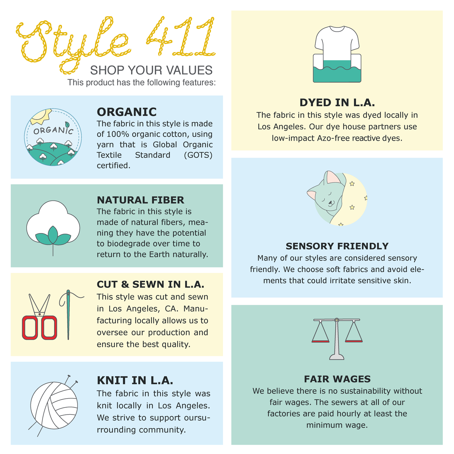 This high-quality, locally knit and dyed organic cotton baby rib fabric allows for airflow to the body, has a nice weight, a soft feel, a good amount of stretch, and washes well for an extended life. Great for those with sensitivities and allergies.