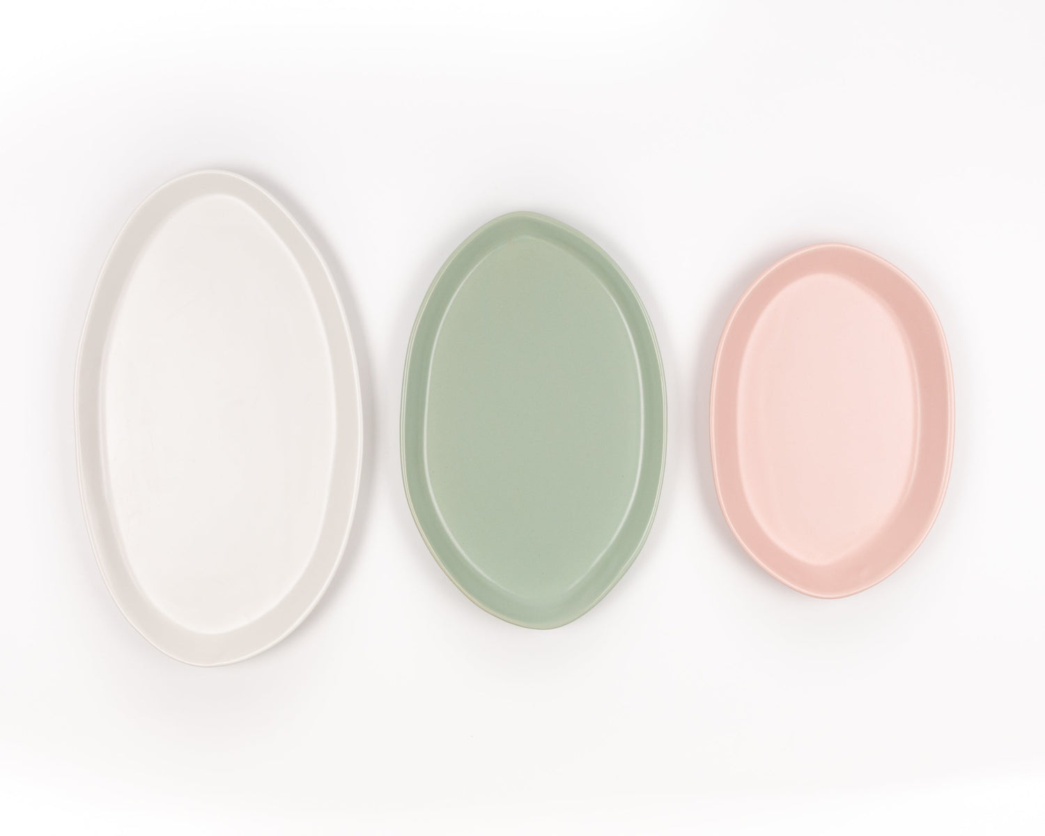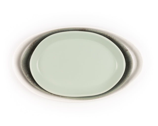 New for Fall 2024: San Tropez: 13" Oval Platter in Buttermilk Pink, 15" Oval Platter in Celadon, 18" Oval Platter in Matte White ; Oslo: 13" Oval Platter in Celadon, 15" Oval Platter in Concrete, 18" Oval Platter in Birch