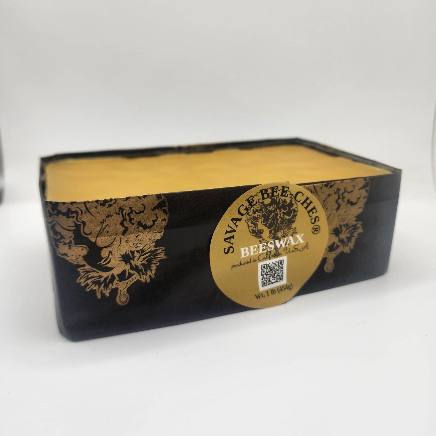 SAVAGE BEE-CHES beeswax offered in convenient one-pound blocks. Sourced from the diverse blossoms of Southern and Central Valley California, our beeswax boasts a rich, dark yellow color indicative of its premium quality. Each block is meticulously filtered to remove any debris, ensuring it's ready for use right out of the package. Ideal for a variety of applications, including cosmetics, and candles, this beeswax provides a natural, sustainable option for your creative and household needs. Experience the natural essence of California with our all-purpose, food-grade beeswax. Read more about beeswax.