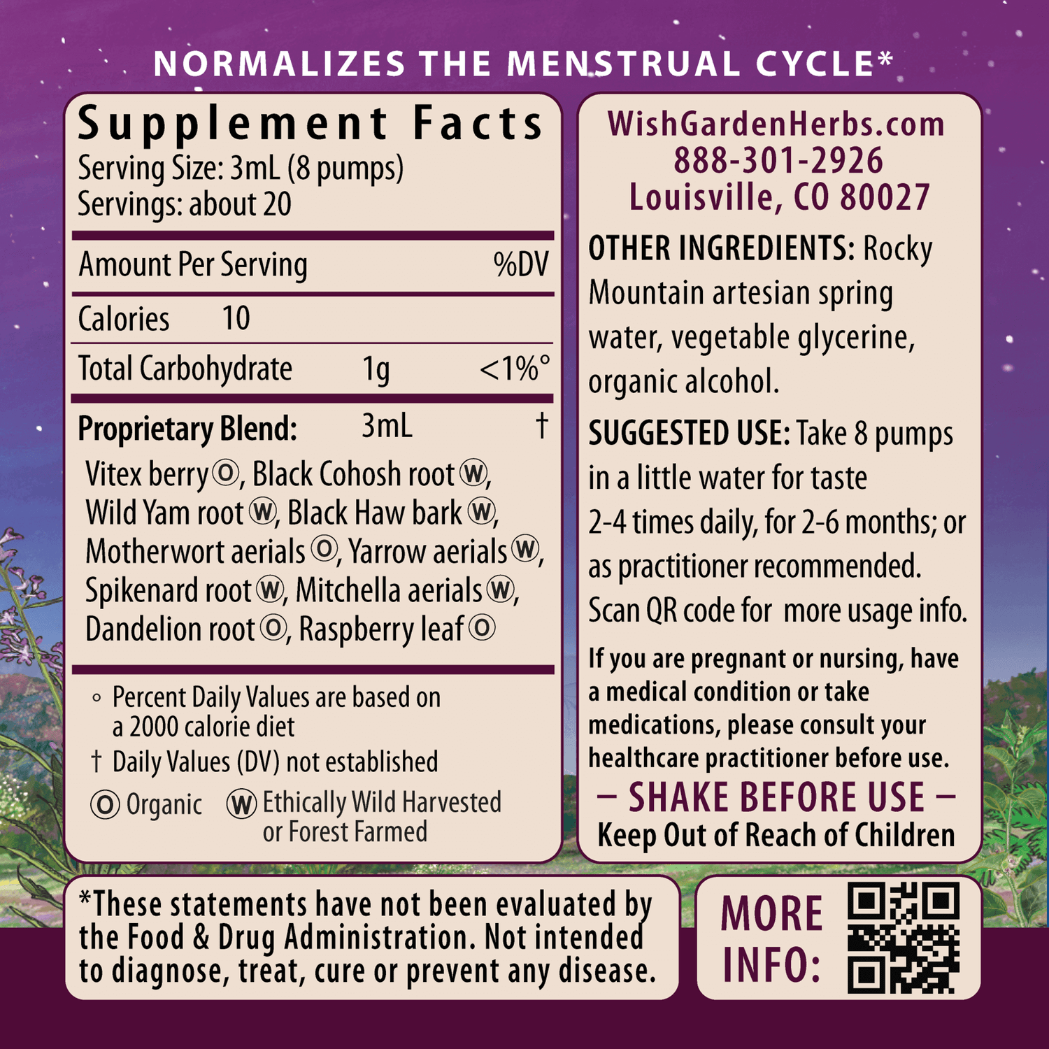 Organic Vitex berry (Vitex agnus-castus), Black Cohosh root (Actaea racemosa (syn. Cimicifuga racemosa)), Wild Yam root (Dioscorea villosa), Black Haw bark (Viburnum prunifolium), organic Motherwort aerials (Leonurus cardiaca), Yarrow aerials (Achillea millefolium), Spikenard root (Aralia racemosa), Mitchella aerials (Mitchella repens), organic Dandelion root (Taraxacum officinale), organic Raspberry leaf (Rubus idaeus), Rocky Mountain artesian spring water, vegetable glycerine & organic gluten-free alcohol.