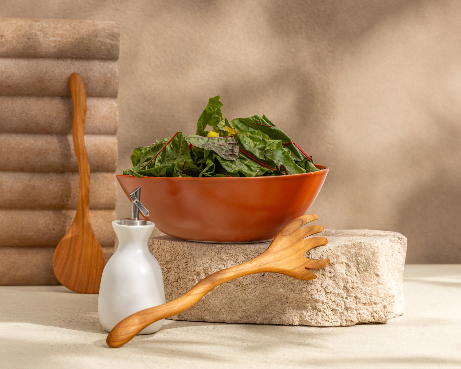 Our Fruit Bowl makes the perfect salad bowl, in addition to being an admirable fruit or produce holder on your countertop, a batter bowl, or a centerpiece. For the full, deluxe, elevated salad experience, pair this bowl with our Olive Oil Cruet and some truly exceptional Olive Oil from our partner, Olive Odyssey.