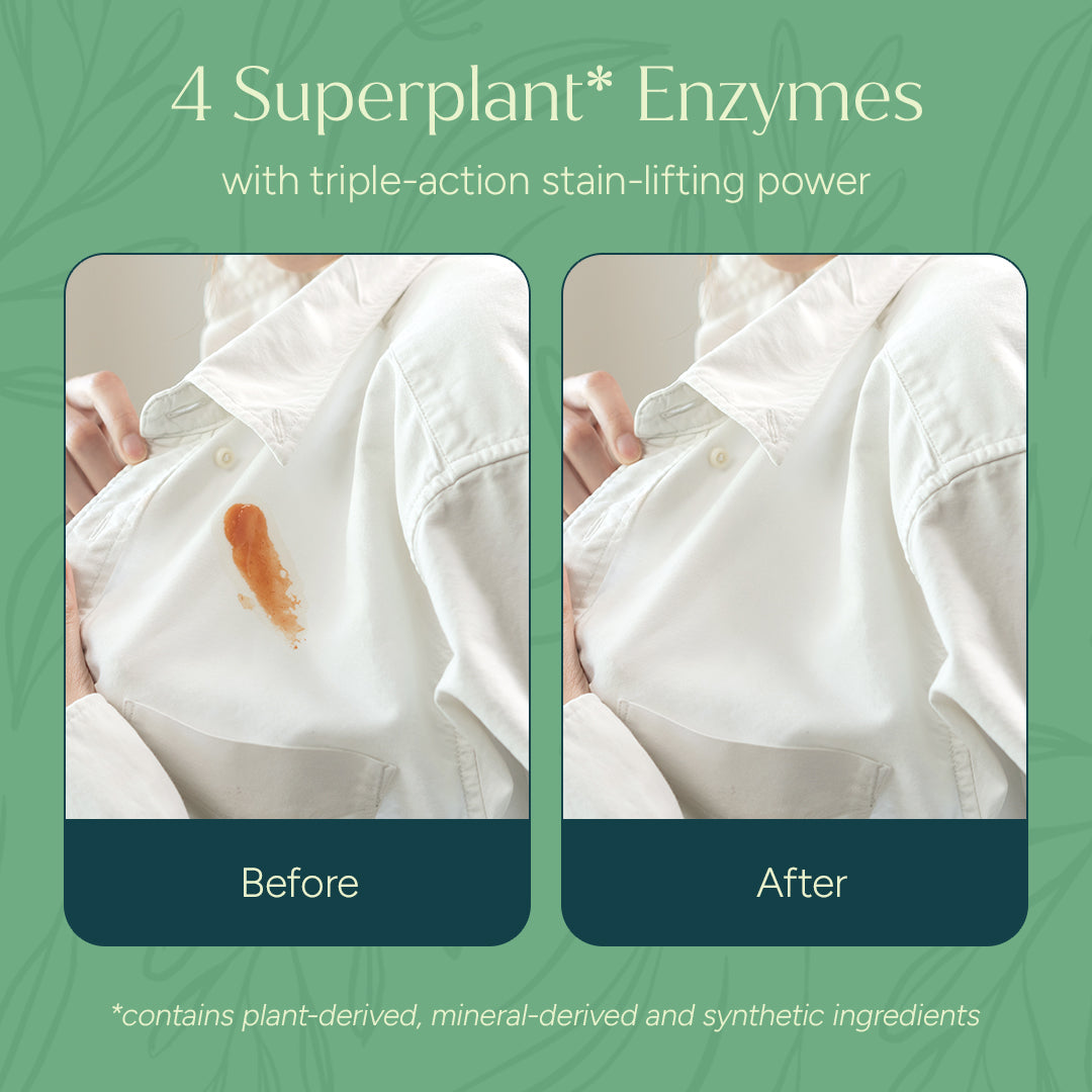 - Clears stains and odors, leaving your fabrics soft, clean, and fresh. Contains these 4 stain-fighting enzymes: