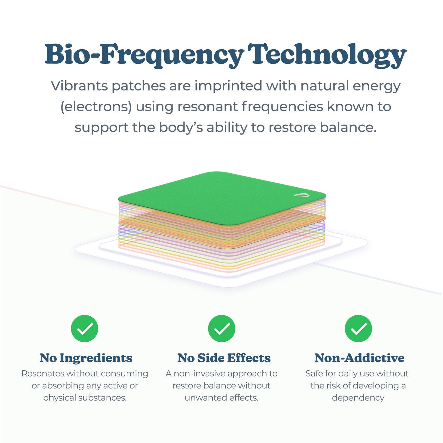 Vibrants patches are imprinted with natural energy (electrons) through resonant frequencies known to support the body’s ability to restore balance.